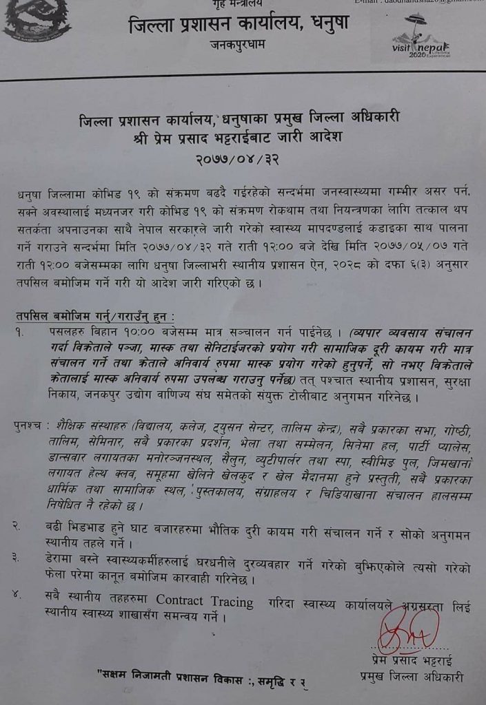 जनकपुरमा १० बजे सम्म पसल खोल्न पाइने, पसलेले ग्राहकलाई मास्क उपलब्ध गराउनु पर्ने (विज्ञप्ति) Posted by सेन्चुरी डेस्क | Aug 16, 2020 | Uncategorized, प्रदेश २ | 0 |