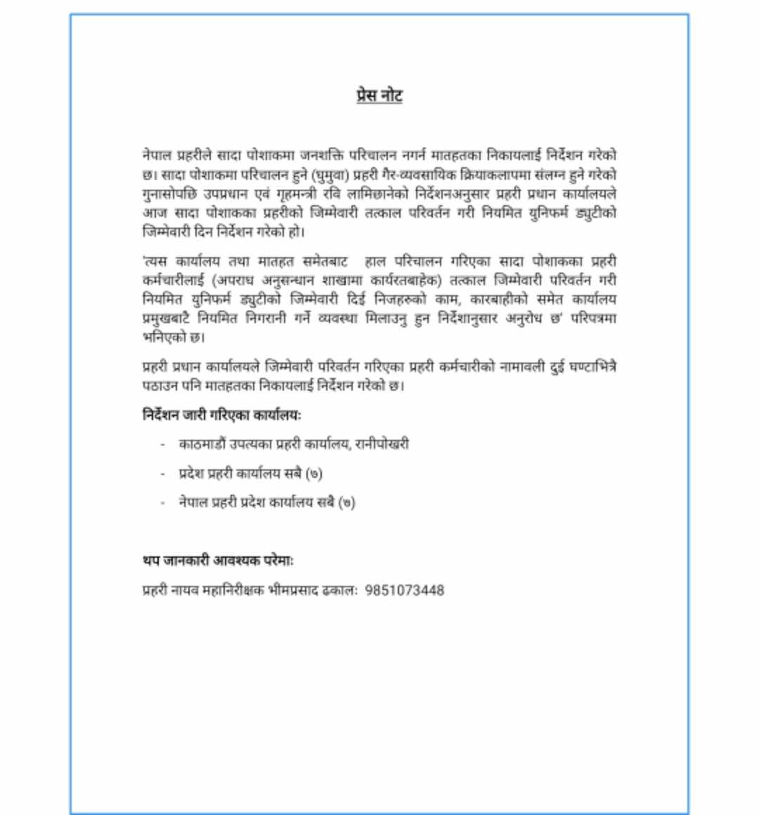 त्यस्तै, प्रहरी प्रधान कार्यालयले जिम्मेवारी परिवर्तन गरिएका प्रहरी कर्मचारीको नामावली दुई घण्टाभित्रै पठाउन पनि मातहतका निकायलाई निर्देशन गरेको छ ।