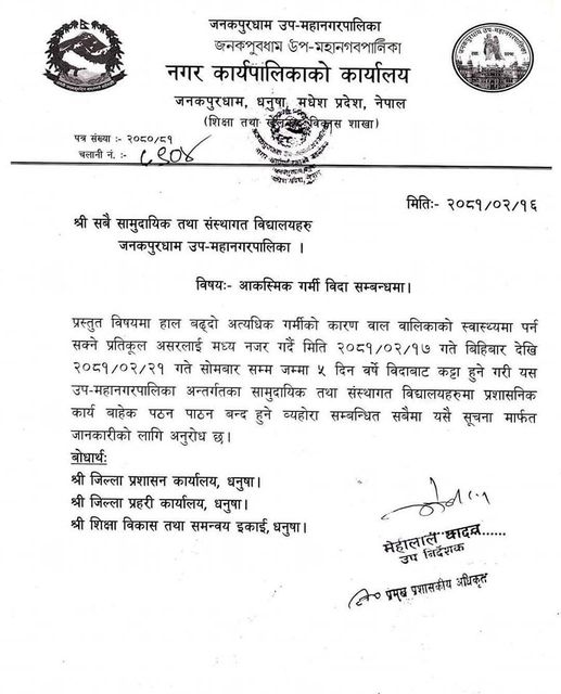 निमित्त प्रमुख प्रशासकीय अधिकृत मेहिलाल यादवले गर्मी अत्यधिक बढेकाले ५ दिन विद्यालयमा आकस्मिक गर्मी विदा दिएको जानकारी दिए । उनका अनुसार जेष्ठ १७ गतेदेखि २१ गतेसम्मका लागि उपमहानगरका सबै सामुदायिक र संस्थागत विद्यालय बन्द रहनेछ ।